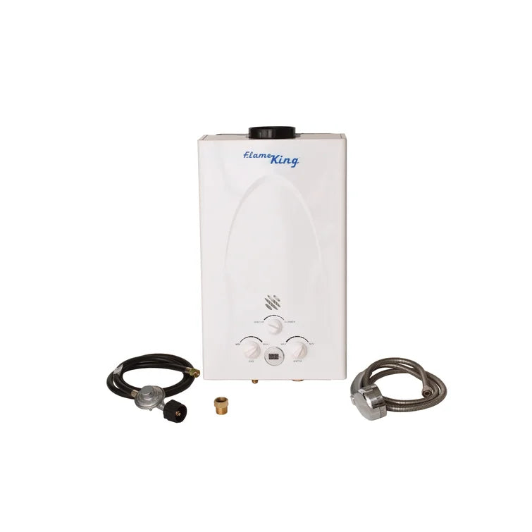 - Accessoires inclus : Régulateur certifié CSA, tuyau de 5 pieds, pommeau de douche avec contrôle on/off et tuyau en acier inoxydable de 4,5 pieds.