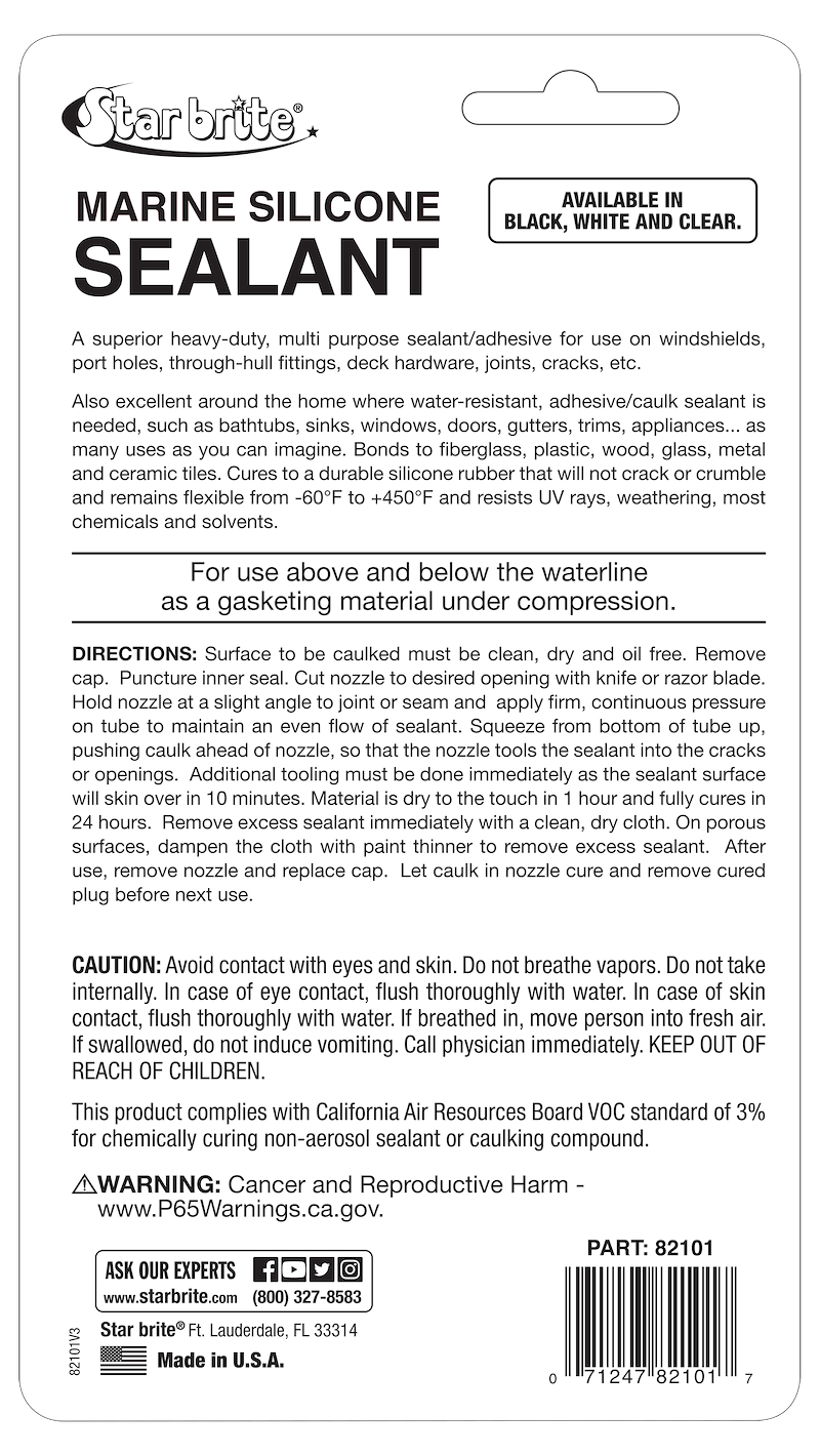 Le scellant silicone marin Star Brite est un silicone 100 % qualité marine conçu pour offrir une étanchéité durable, imperméable et flexible, même dans des conditions exigeantes. Il adhère efficacement à une grande variété de surfaces, ce qui en fait un choix fiable pour les applications nautiques, récréatives et industrielles.
